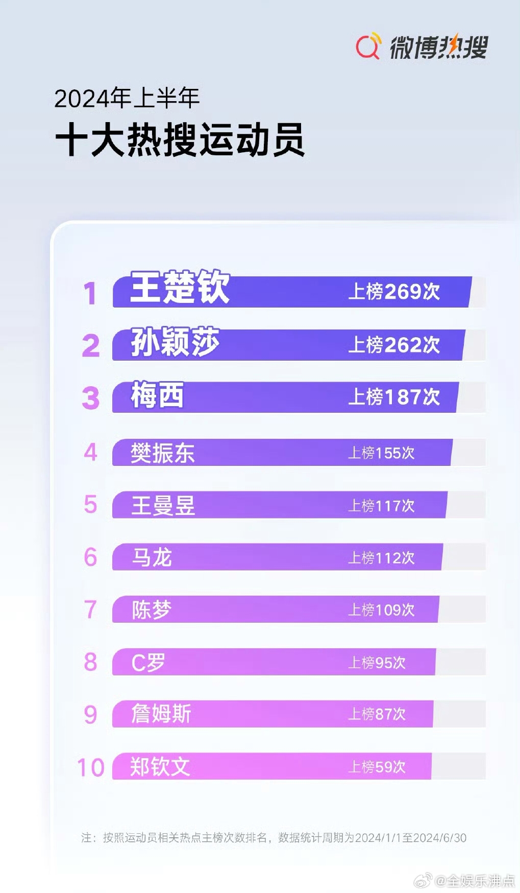 2024年微博十大热搜运动员:乒乓球7席&占据前3,足篮无人上榜 2025-03-01 13:07:45 综合报道 89℃ 0 03月01日讯 微博热搜发布了2024年全年的十大热搜体育运动员,其中乒乓球运动员占了7席,另外3人为网球郑钦文,跳水全红婵,游泳潘展乐。足球和篮球运动员则是无人上榜。而在此前发布的2024上半年热搜中,还有着梅西C罗和詹姆斯这样的足篮球员。 标签: 十大乒乓球 上一篇:纳瓦罗止步迪拜站第三轮,郑钦文保住世界第8排名 下一篇:官方:卫冕冠军奥沙利文因身体原因退出斯诺克世界大奖赛 相关推荐 ⚽️👀🎾胡梅尔斯和女友现场观战ATP斯图加特站决赛 WTA250斯海尔托亨博斯站:袁悦击败比勒尔 首次闯入草地巡回赛8强 吕小军:只要意志坚定就没有到不了的高度 40岁 我还在努力 出战主场比赛!阿斯顿马丁车手斯特罗尔自宣将出战F1加拿大站